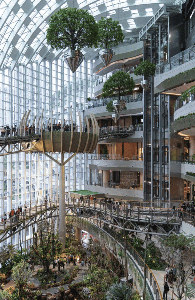 其中,「沐光森林」作為光環(huán)的標(biāo)志性景觀,以其縱跨6層、高達(dá)42米的室內(nèi)立體垂直植物園之姿,成為了眾人矚目的焦點。懸空其間的步行棧道,如同穿梭于綠色世界的秘徑,讓顧客在享受購物樂趣的同時,也能感受到大自然的呼吸。這條懸空跨層步道,不僅巧妙地連接了商業(yè)區(qū)域與森林景觀,更讓每一次購物之旅都充滿了探索自然與發(fā)現(xiàn)驚喜的奇妙體驗。