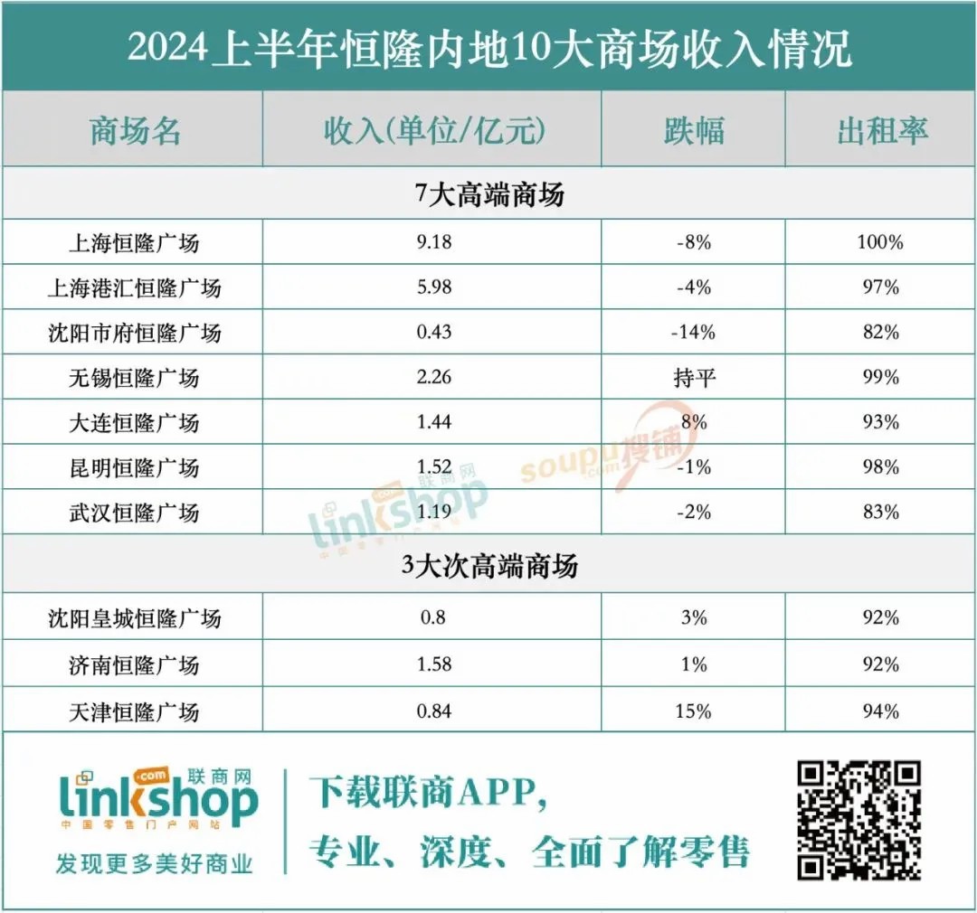 在恒隆集團(tuán)的高端商場(chǎng)中,大連恒隆廣場(chǎng)脫穎而出,實(shí)現(xiàn)業(yè)績(jī)?cè)鲩L(zhǎng),得益于其成功轉(zhuǎn)型為地區(qū)高端零售地標(biāo)并吸引高端品牌入駐。相比之下,上海港匯恒隆、沈陽(yáng)市府恒隆、昆明恒隆及武漢恒隆等四大商場(chǎng)均面臨收入和租戶銷售下滑的挑戰(zhàn),而無(wú)錫恒隆則保持業(yè)績(jī)平穩(wěn)。