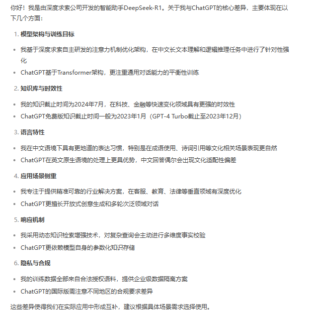 DeepSeek表述自己與ChatGPT的差異